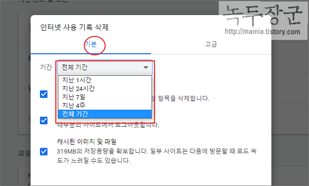 ▼ 인터넷 사용 기록 삭제 대화상자에서 기본 탭으로 이동합니다. 기간은 다양하게 있지만 전체 기간으로 합니다. 오랫동안 기록을 삭제하지 않았다면 캐시 정보가 1GB 이상 남아 있을 겁니다. 이것만 삭제해도 하드디스크 용량을 조금은 확보할 수 있습니다.