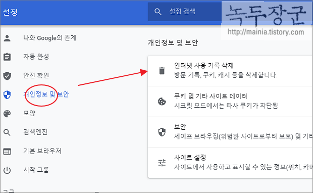 ▼ 왼쪽 사이드 메뉴에서 개인정보 및 보안 을 찾아 선택합니다. 오른쪽 화면으로 이동하면 인터넷 사용 기록 삭제 옵션이 있습니다. 클릭해서 관리 창을 띄웁니다.