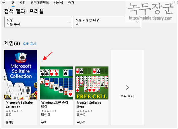 ▼ 검색된 무료 게임 중 Microsoft Solitaire Collection 을 선택합니다. 여기에 프리셀뿐만 아니라 다른 종류의 카드 게임도 포함되어 있습니다.