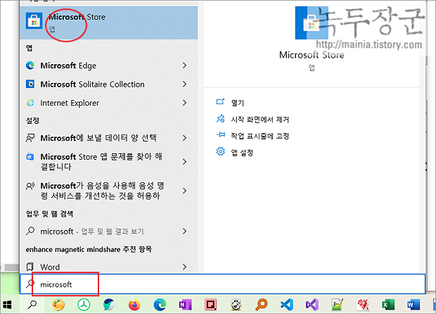 ▼ 윈도우10 이전에 기본으로 깔려 있던 게임들을 설치하기 위해서는 마이크로소프트 스토어를 이용해야 합니다. 작업 표시줄에 있는 검색란을 이용해서 윈도우 스토어 앱을 찾습니다.