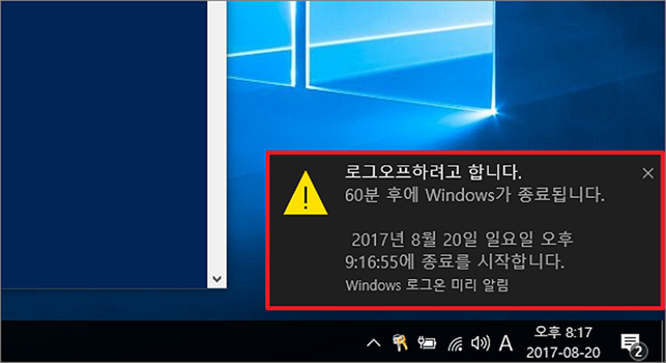 ▼ 종료 예약 등록 여부는 윈도우 미리 알림 창에서 알 수 있습니다. 작업 표시줄 오른쪽 끝에 컴퓨터가 언제 종료 되는지 상세하게 설명한 알림창이 나오면 제대로 등록된 것입니다.