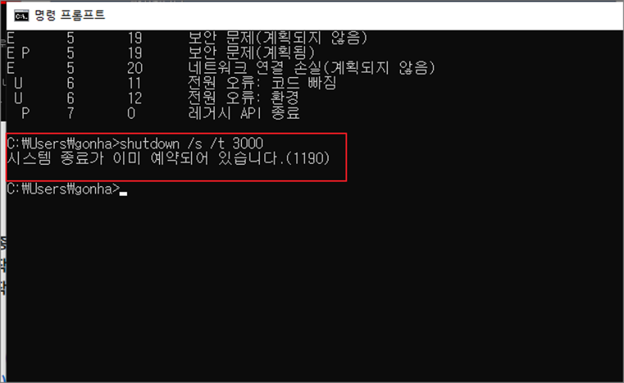 ▼ 시간 설정은 하나만 가능합니다. 종료 설정이 되어 있는 상태에서 아래와 같은 명령어를 입력하면 이미 예약되어 있다고 뜹니다.