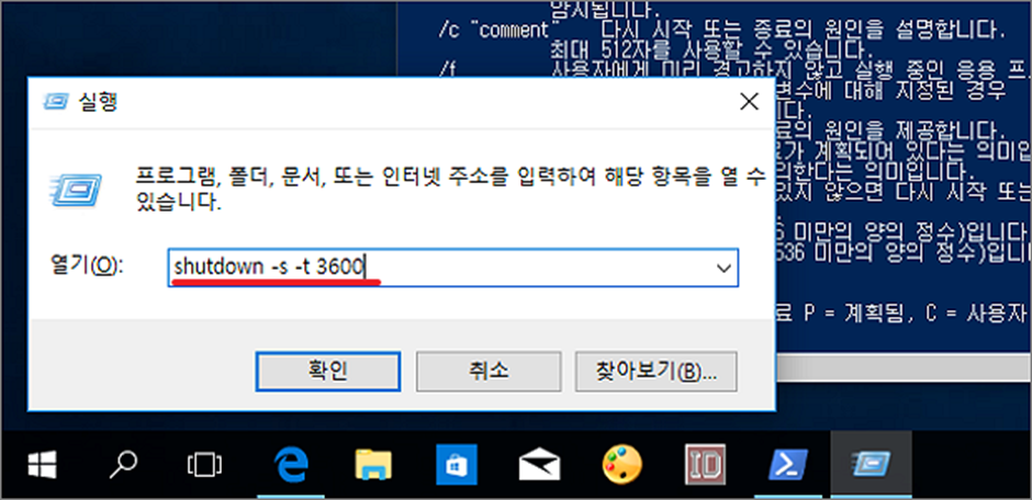 ▼ 예약 종료 명령어를 실행하는 방법은 2가지 입니다. 윈도우키 + R 을 누르면 뜨는 실행창 또는 윈도우 파워셀을 이용하는 것입니다. 먼저 실행창을 띄워서 shutdown –s –t 3600 을 입력합니다. 입력한 내용을 설명하자면 shutdown.exe 프로그램에 –s –t 3600 파라미터를 넘기는데, 3600 은 60분을 뜻합니다. 초 단위이기 때문에 분으로 환산하면 60분이 되겠죠. –s 는 컴퓨터 종료를 의미합니다.