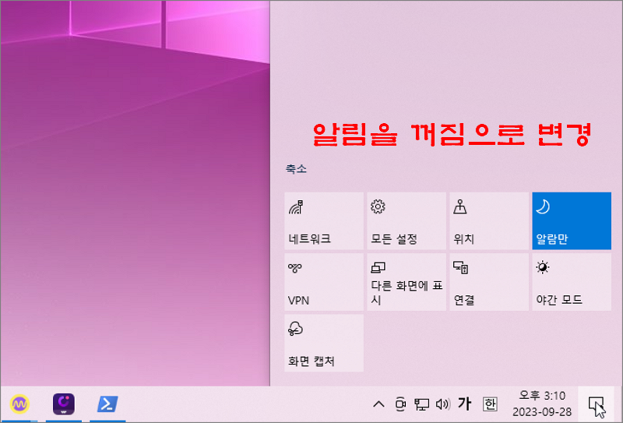 ▼ 오른쪽 하단에 알림을 꺼짐으로 변경해야 시간 설정 메시지가 화면에 나타납니다.
