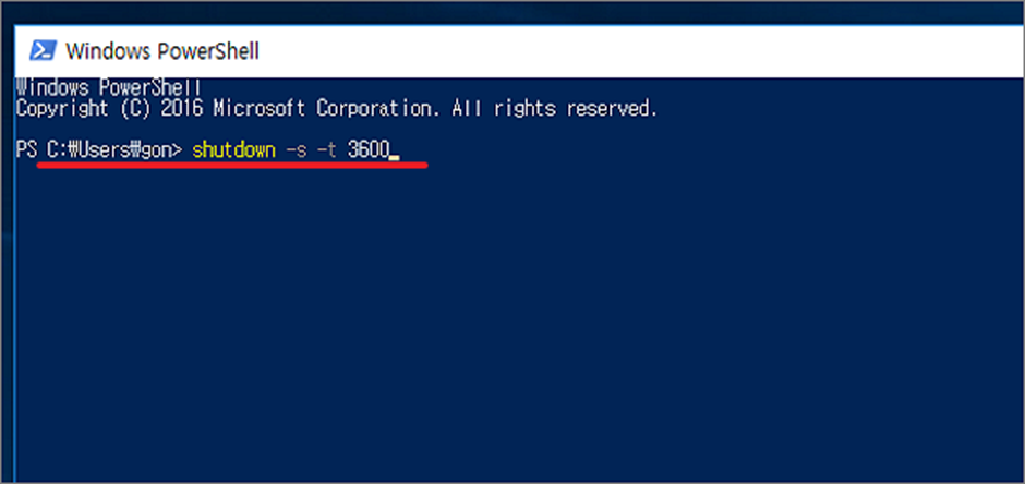 ▼ 파워셀을 실행하고 명령어로 위에서 입력한 내용을 그대로 넣습니다. Enter 를 누르면 윈도우 종료 예약이 등록됩니다.