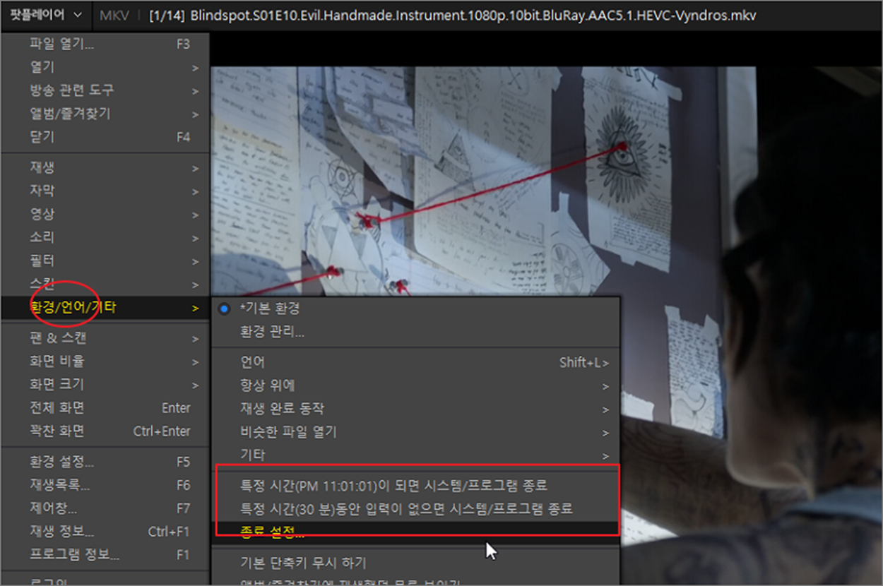 ▼ 대부분의 동영상 플레이어에는 컴퓨터와 플레이어를 동시에 종료하는 옵션이 있습니다. 아래 동영상은 팟플레이어 입니다. 메뉴 목록에서 환경/언어/기타 > 시스템/프로그램 종료 옵션을 이용한 종료가 가능합니다.