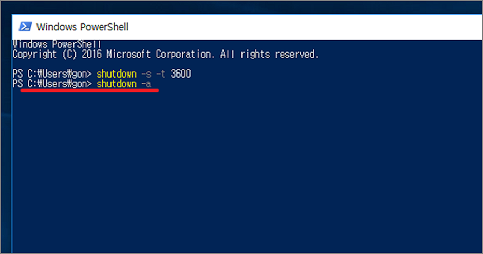 ▼ 다음은 종료를 취소하는 방법입니다. 취소 방법은 간단합니다. shutdown 파라미터로 –a 를 넘기면 이전에 등록한 종료 예약은 사라집니다.