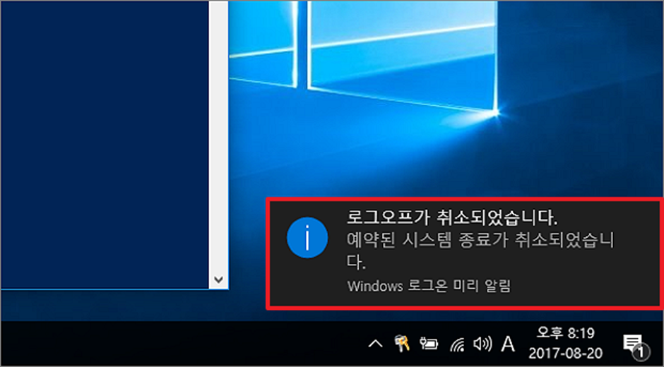 ▼ 컴퓨터 종료를 취소한 결과도 윈도우 알림창에 나타나기 때문에 제대로 적용이 됐는지 확인할 수 있습니다.