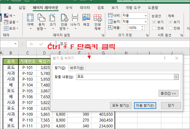 ▼ 검색창을 띄우는 단축키는 Ctrl + F 입니다. 찾을 내용에 값을 입력해서 "다음 찾기" 나 "모두 찾기" 버튼을 눌러 검색을 진행합니다.