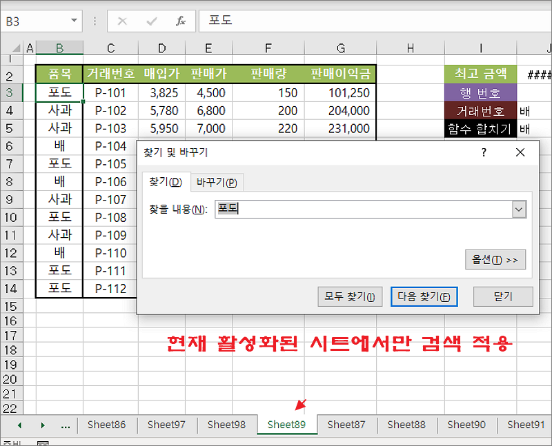 ▼ 기본 검색 범위는 활성화된 시트에서만 이루어 집니다. 여러 시트를 한번에 검색하고 싶다면 어떻게 해야 될까요?