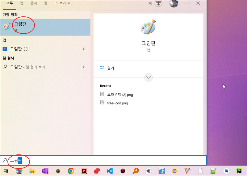 ▼ 그림판은 윈도우 보조프로그램 안에 있습니다. 빠르게 프로그램을 찾고 싶다면 검색창에 [그림판] 이라고 입력합니다.