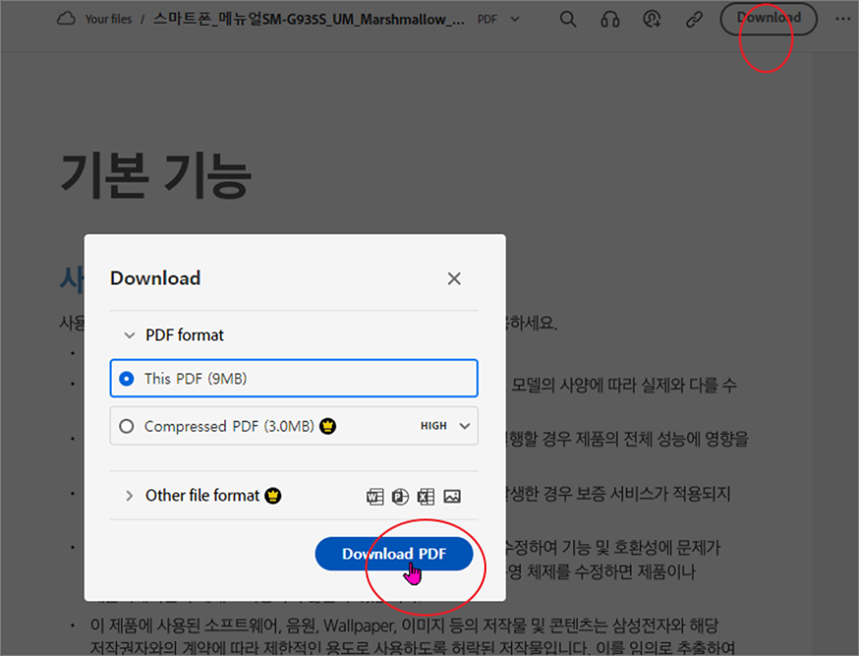 ▼ 삭제가 모두 끝났다면 오른쪽 상단 다운로드 버튼을 클릭합니다. 화면에 뜬 팝업창에서 Download PDF 를 눌러 편집한 파일을 저장합니다.