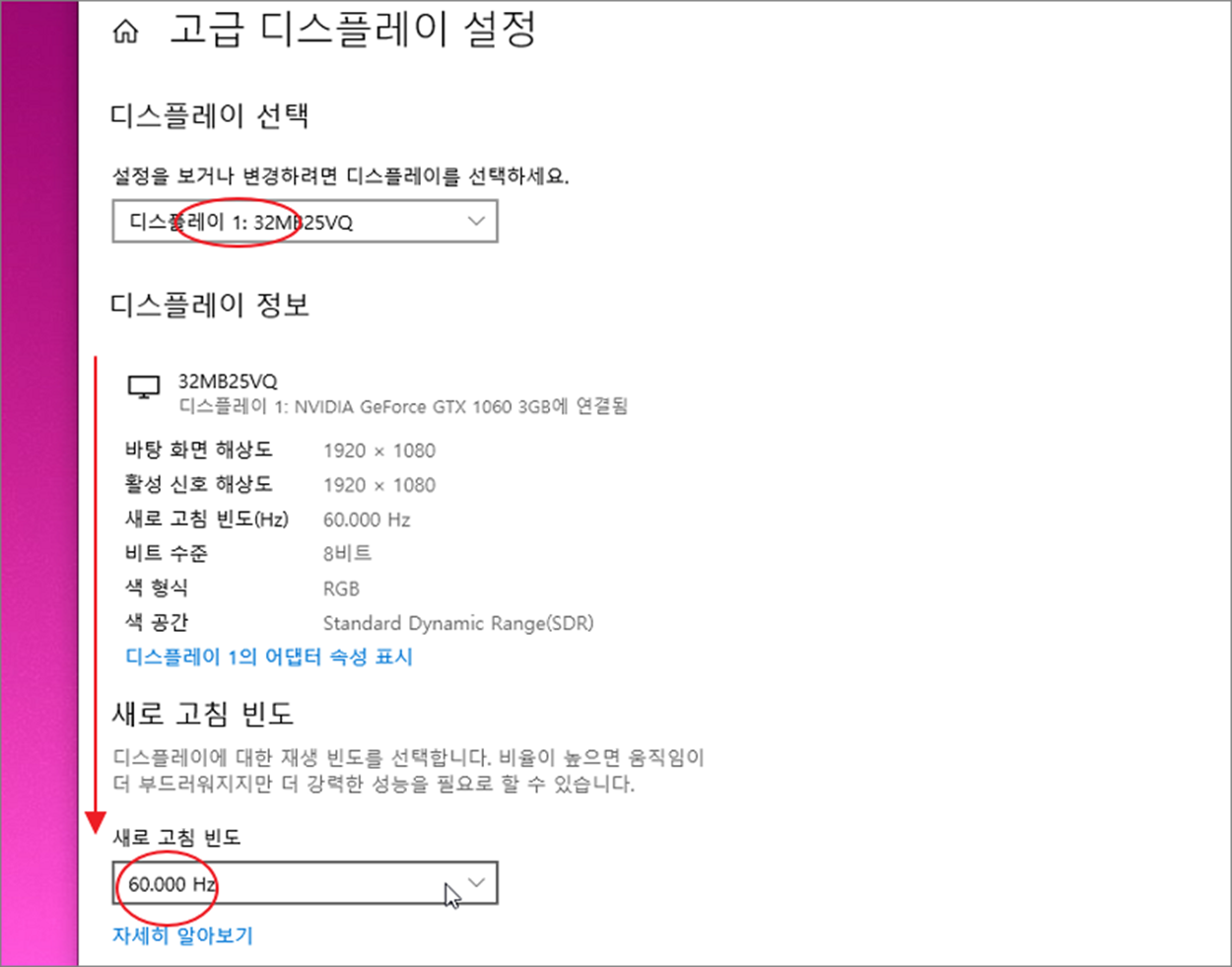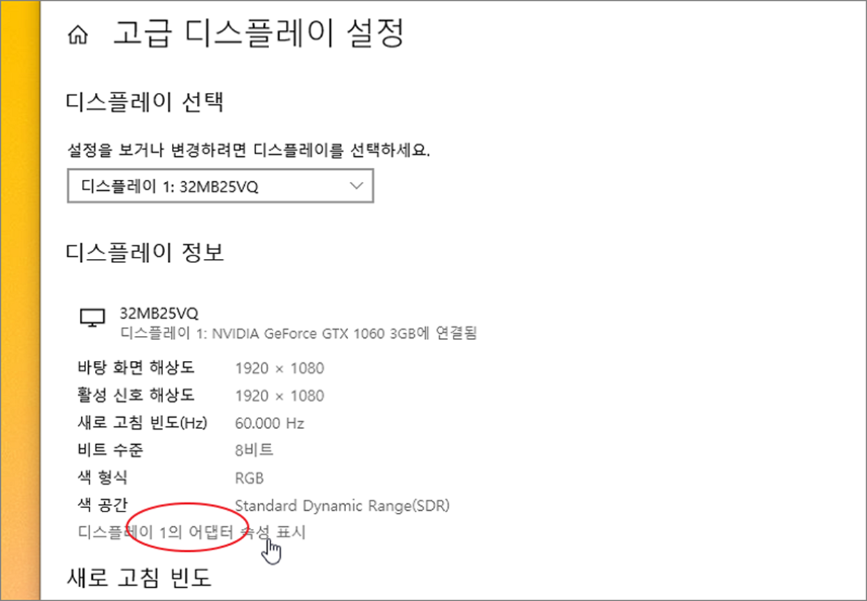 ▼ 고급 디스플레이 설정 화면 상단에서 주사율 확인이 필요한 모니터를 선택합니다. 화면 아래로 내려가면 현재 선택한 모니터의 주사율을 확인할 수 있습니다. 주사율(새로 고침 빈도) 가 60Hz 을 확인했습니다. 주사율을 높이거나 내리고 싶을 때도 해당 박스를 이용합니다. 제가 가지고 있는 모니터는 60Hz 이상은 지원하지 않습니다.