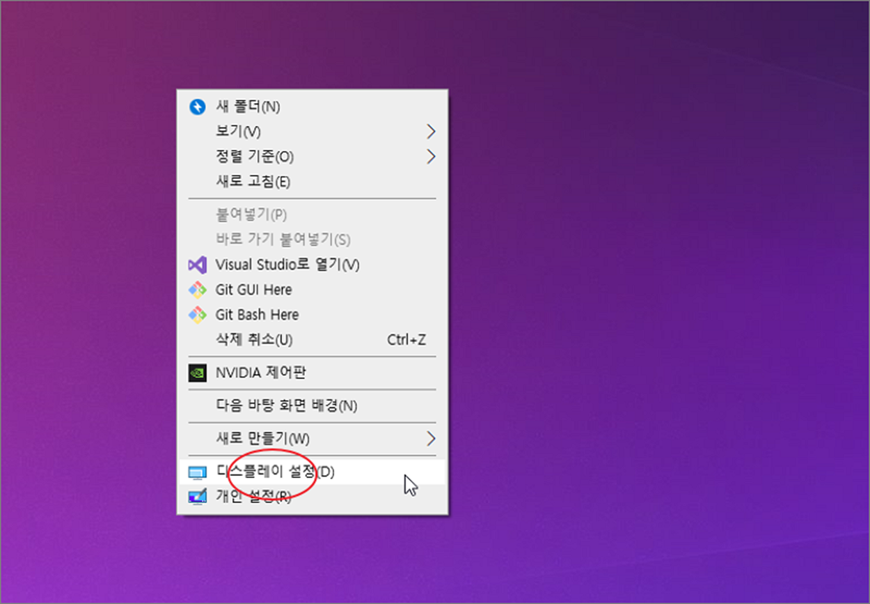 ▼ 모니터 주사율을 확인하기 위해서는 디스플레이 설정으로 가야 합니다. 바탕화면에 오른쪽 마우스를 누른 후 팝업 메뉴에서 [디스플레이 설정] 메뉴를 선택합니다.