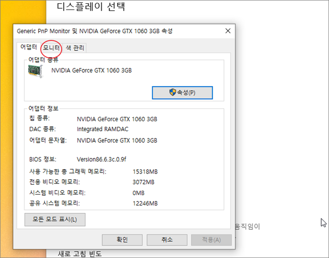 ▼ 다음 어댑터 속성 표시 팝업창이 뜨면 [모니터] 탭으로 이동합니다.