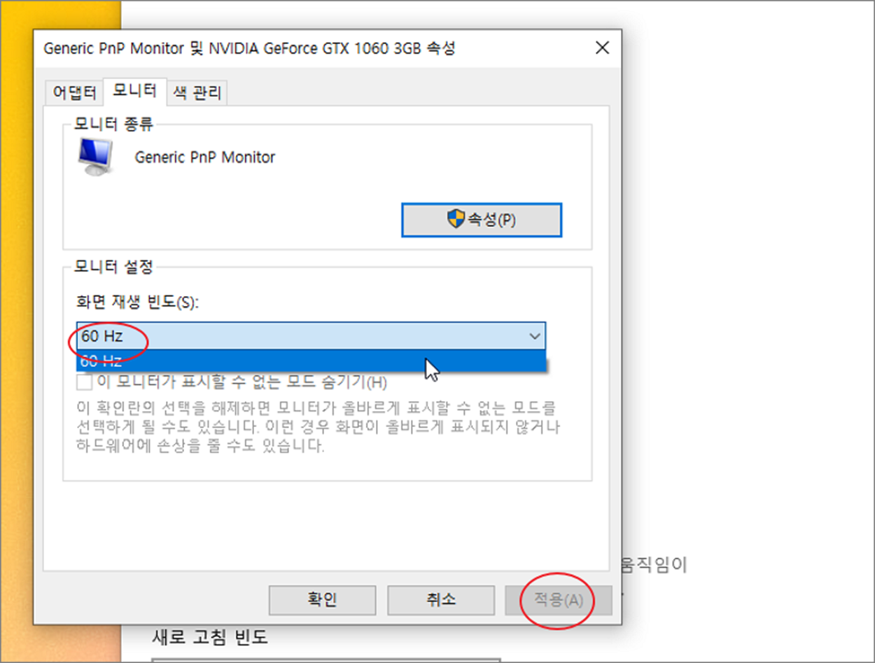 ▼ 모니터 탭에서 모니터 설정 항목으로 가면 [화면 재생 빈도]를 볼 수 있습니다. 기본 64hz 로 설정이 되어 있습니다. 만약 이보다 낮거나 높은 hz 를 설정하고 싶다면 목록에서 값을 선택하고 확인 버튼을 눌러 줍니다.