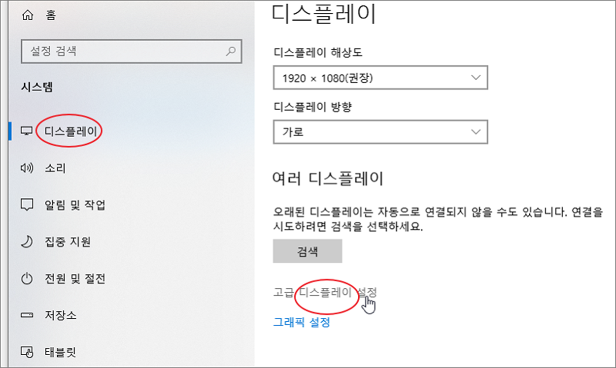 ▼ 디스플레이 옵션 화면이 나타나면 오른쪽 화면으로 가서 아래로 갑니다. 그리고 [고급 디스플레이 설정] 메뉴를 찾아 클릭합니다.