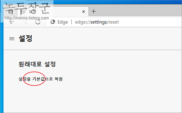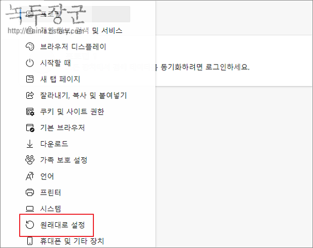 ▼ 먼저 첫 번째 브라우저 초기화 방법입니다. 설정 왼쪽 사이드 메뉴에서 원래대로 설정을 선택합니다.