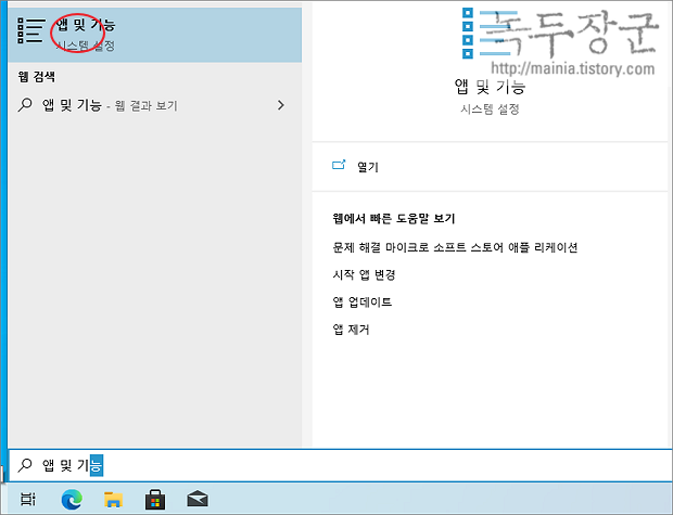 ▼ 다음은 두 번째 초기화 방법입니다. 앱 삭제가 가능한 앱 및 기능 설정 화면으로 이동합니다. 검색을 이용하면 빠르게 이동할 수 있습니다.