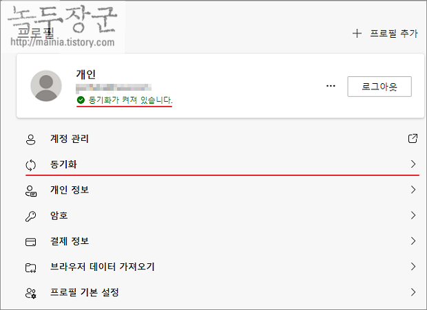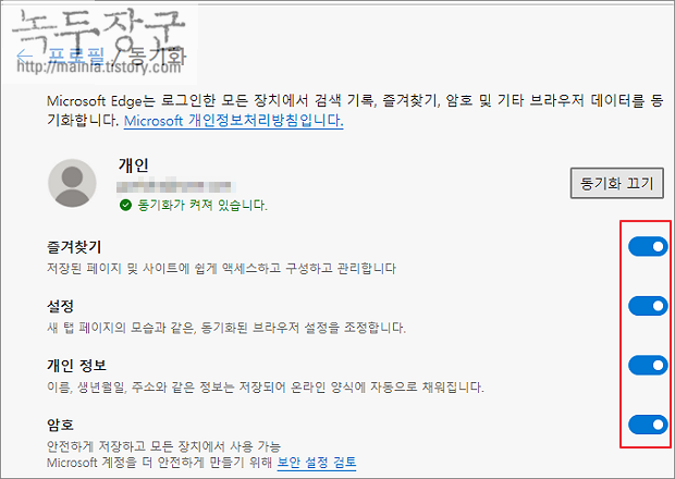 ▼ 동기화 항목에서 불필요한 것들은 끔으로 설정을 변경합니다.