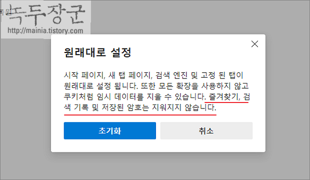 ▼ 원래대로 설정할 것인지 묻는 팝업창이 뜨면 초기화 버튼을 누릅니다. 팝업창의 설명에도 나와 있듯이 즐겨찾기, 검색 기록 및 암호는 삭제하지 않습니다. 만약 삭제되더라도 클라우드에 동기화한 정보를 끌어와서 복구할 수 있습니다.