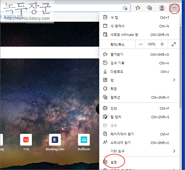 ▼ 먼저 엣지 브라우저 초기화 전에 설정 정보를 클라우드에 백업하는 것이 좋습니다. 설정 초기화는 개인정보, 암호, 결제정보 등은 삭제하지 않지만 어떻게 될지 모르기 때문입니다. 마이크로소프트 계정이 있다면 브라우저에서 로그인하고 더보기 > 설정 메뉴를 선택합니다.