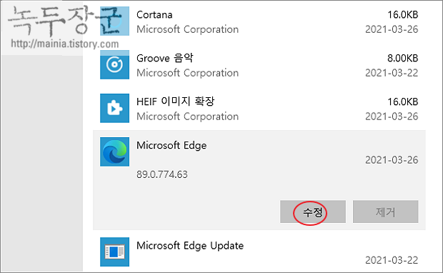 ▼ 마이크로소프트 엣지 앱을 클릭하면 화면이 확장되는데, 수정과 삭제 버튼이 나타날 겁니다. 수정 버튼을 누르면 PC 가 재시작될 때 업데이트가 이루어지면서 초기화가 진행됩니다.