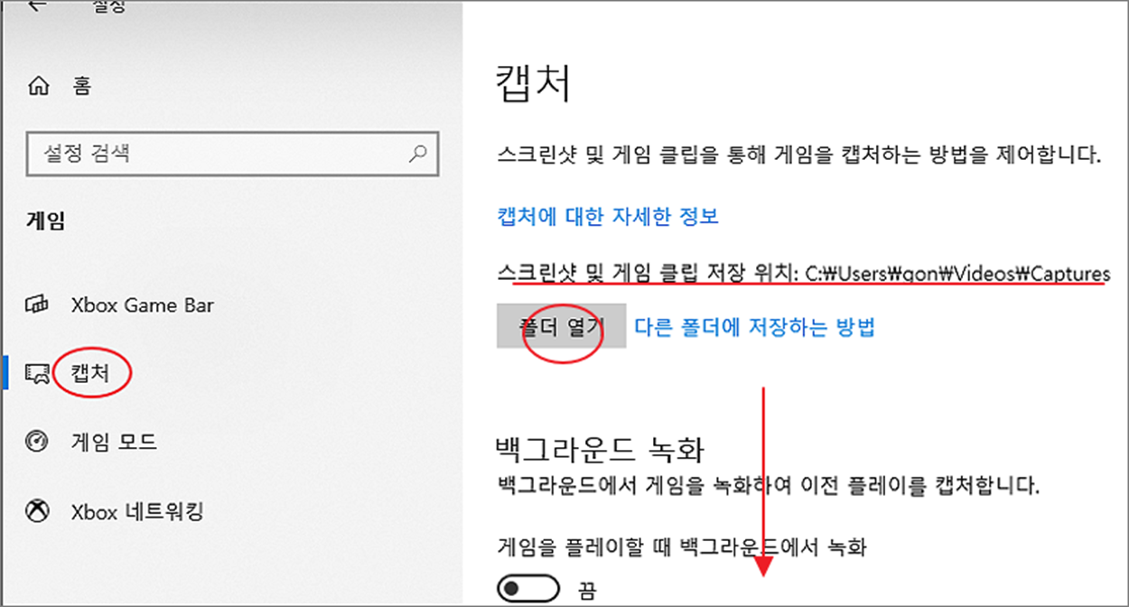 ▼ 두 번째 메뉴인 캡처 는 크린샷 및 게임 클립, 녹화한 영상의 위치를 지정합니다. 그리고 녹화할 때 오디오와 비디오의 옵션을 조절하는 곳입니다.