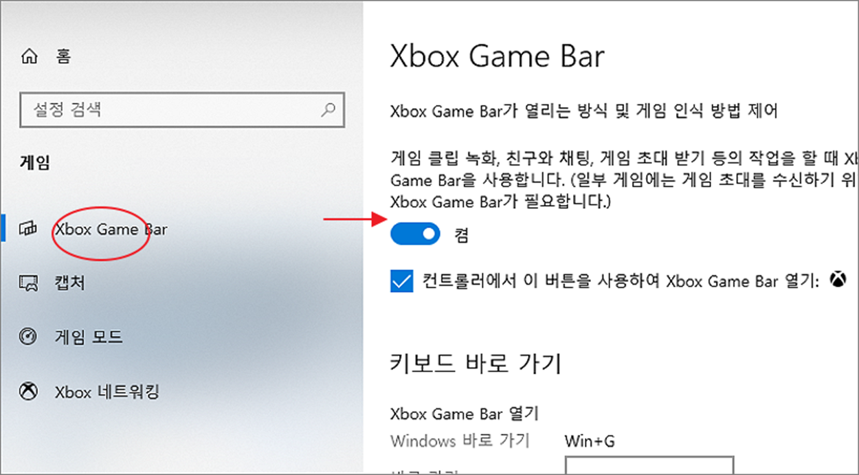 ▼ 게임 설정화면에 첫 번째 메뉴인 [Xbox Game Bar]를 선택합니다. 게임 바는 게임 실행화면에 뜨는 컨트롤 바를 말합니다. 게임 모드 컨트롤을 바 형태의 창에서 마우스 클릭으로 제어할 수 있게 해 주는 팝업창입니다. 상단에 켬으로 바꾸고 단축키 Win(윈도우키) + G 를 누르면 게임바를 오픈할 수 있습니다. 바로 아래에는 게임 바와 관련된 여러 단축키들을 볼 수 있습니다.