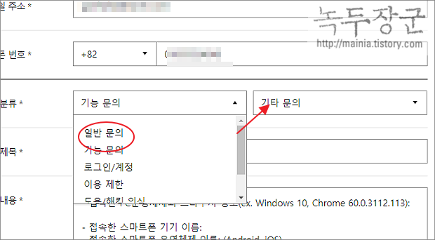▼ 바로 아래 항목에서는 문의할 내용에 해당하는 카테고리를 지정해야 합니다. 빠른 응답을 원한다면 최대한 관련있는 카테고리를 지정하는 것이 좋습니다. 카테고리는 두 단계를 선택해야 합니다. 애매한 경우 기타 문의로 합니다.