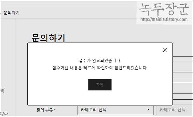 ▼ 화면에 접수 완료 메시지가 뜨면 입력한 메일로 접수되었다는 메시지가 도착합니다. 답변은 메일로 받고, 휴대폰으로는 메시지 알림이 올 겁니다.