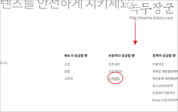 ▼ 티스토리 메인 페이지로 접속했다면 화면 제일 아래로 이동합니다. 메뉴 목록에서 사용하다 궁금할 땐 > 고객센터 메뉴를 클릭합니다.