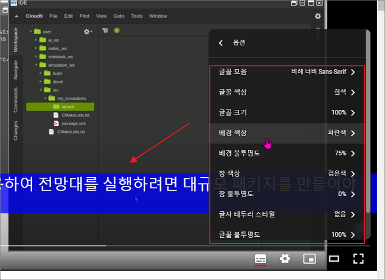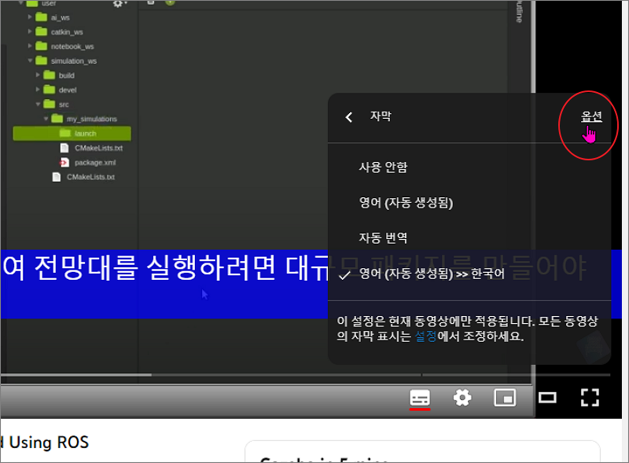 ▼ 만약 표시된 자막이 영상에서 잘 보이지 않는다면 자막 표시 영역에 디자인을 변경해 보세요. 오른쪽 하단에 설정 > 자막 > 옵션 메뉴를 차례대로 클릭합니다.