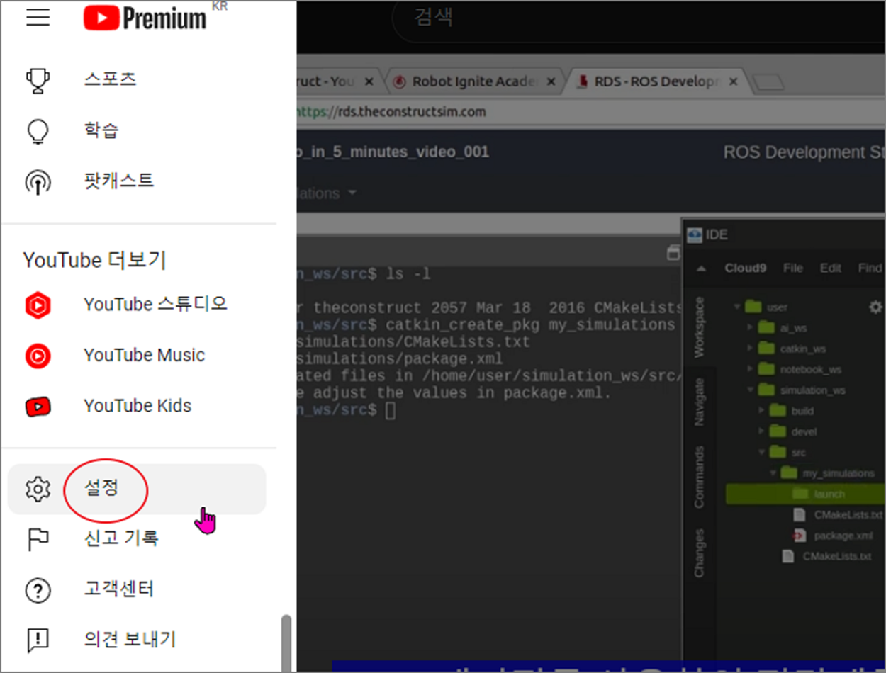 ▼ 만약 자동 자막 추가 메뉴가 보이지 않는다면 유튜브 설정을 체크해 보아야 합니다. 왼쪽 상단 더보기 > 설정 메뉴로 이동합니다.