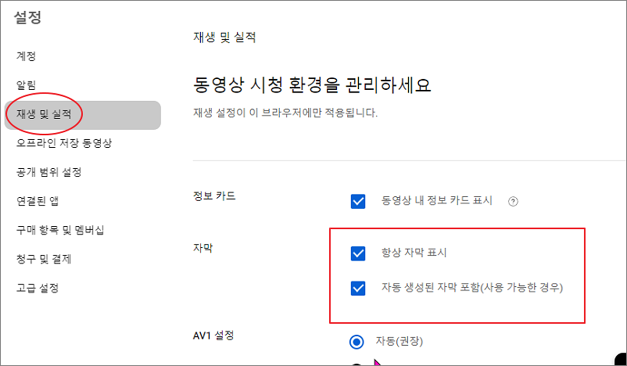 ▼ "재생 및 실적" 으로 이동해서 "자막" 항목에 있는 두 옵션을 모두 체크합니다. 이상으로 유튜브 영상에 한국어 자막을 자동으로 추가하는 방법에 대해 알아보았습니다.