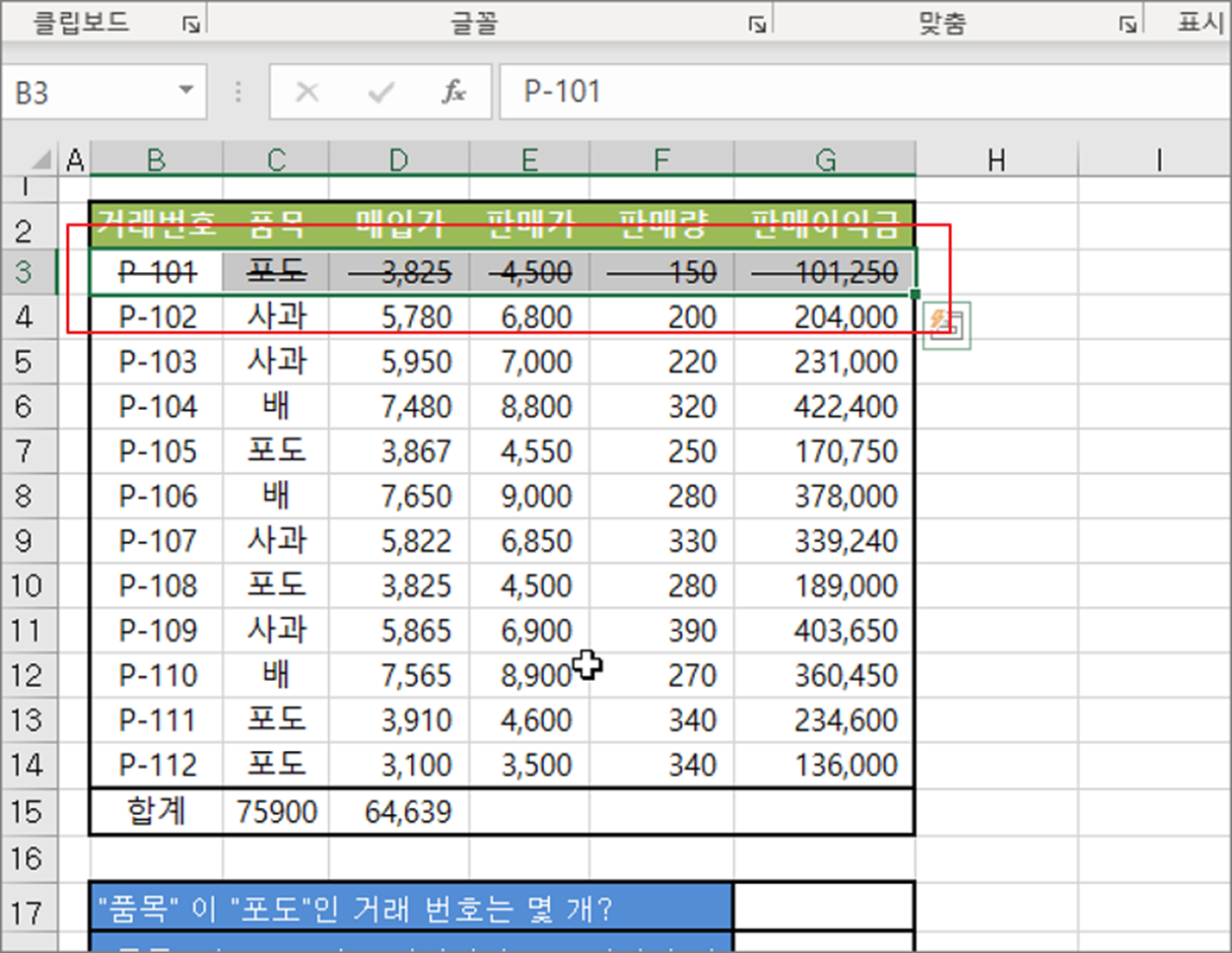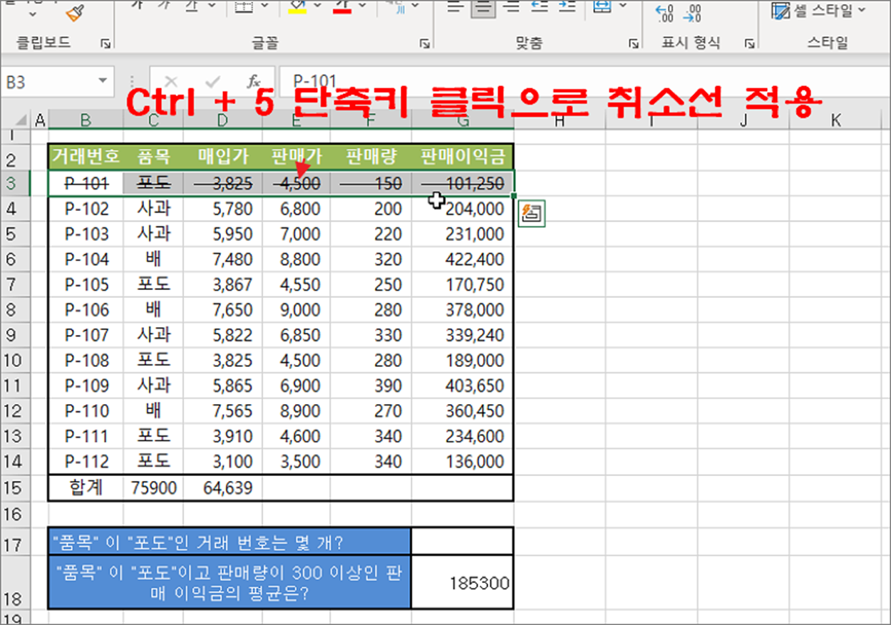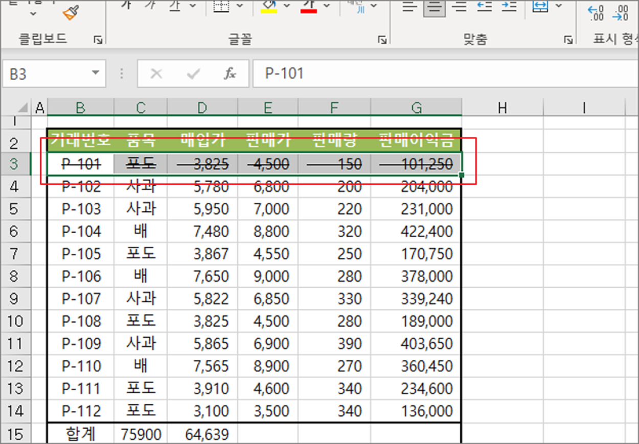 ▼ 선택한 셀의 텍스트에는 취소선이 그어져 있는 것을 확인할 수 있습니다.