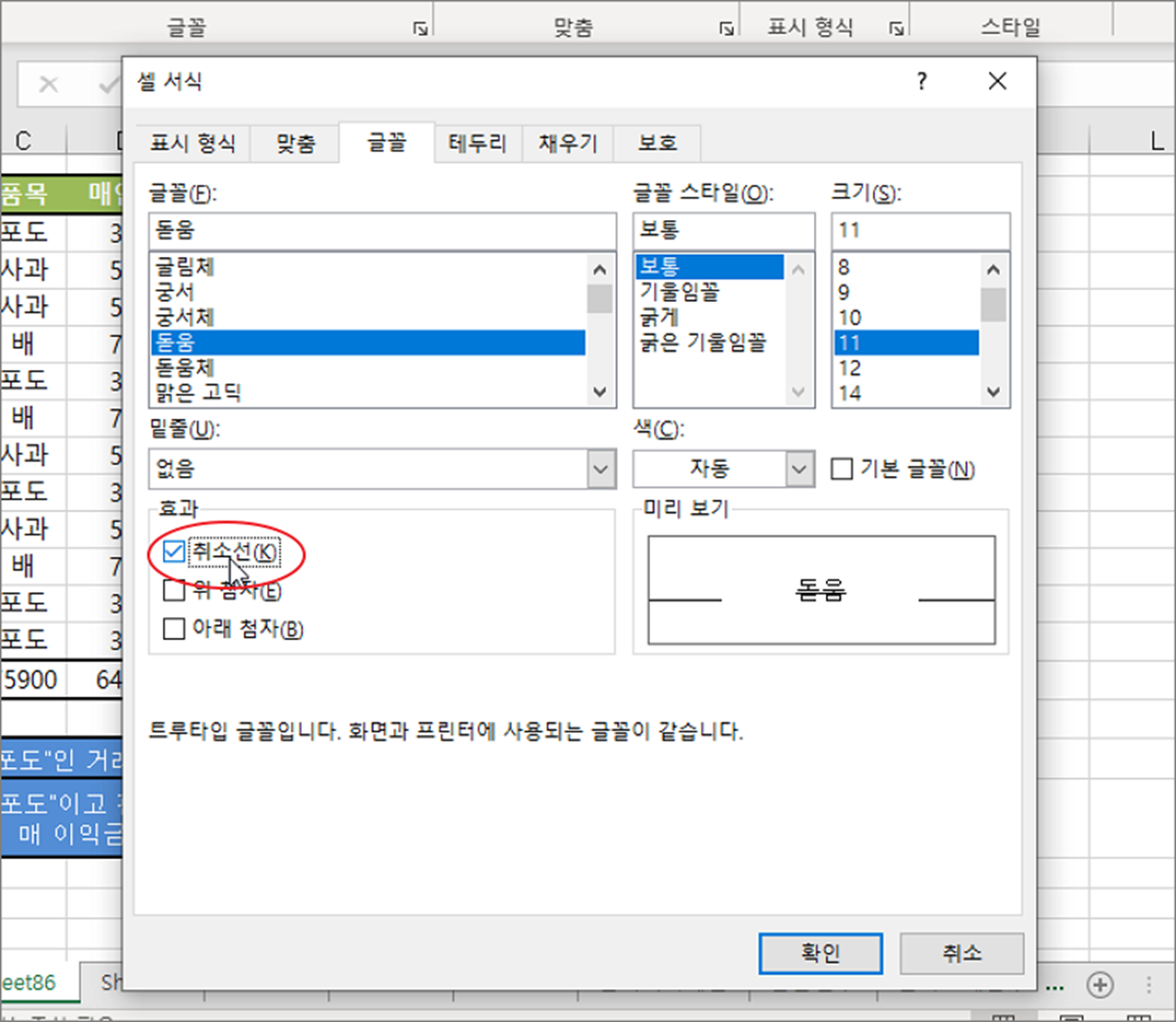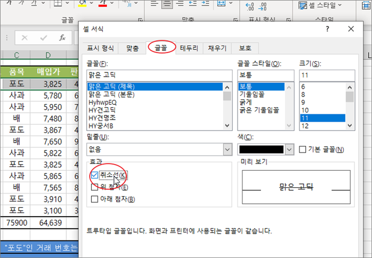 ▼ 셀 서식 대화상자에서 [글꼴] 탭으로 갑니다. 글꼴 탭 화면 아래 효과 섹션에 [취소선] 옵션이 있습니다.