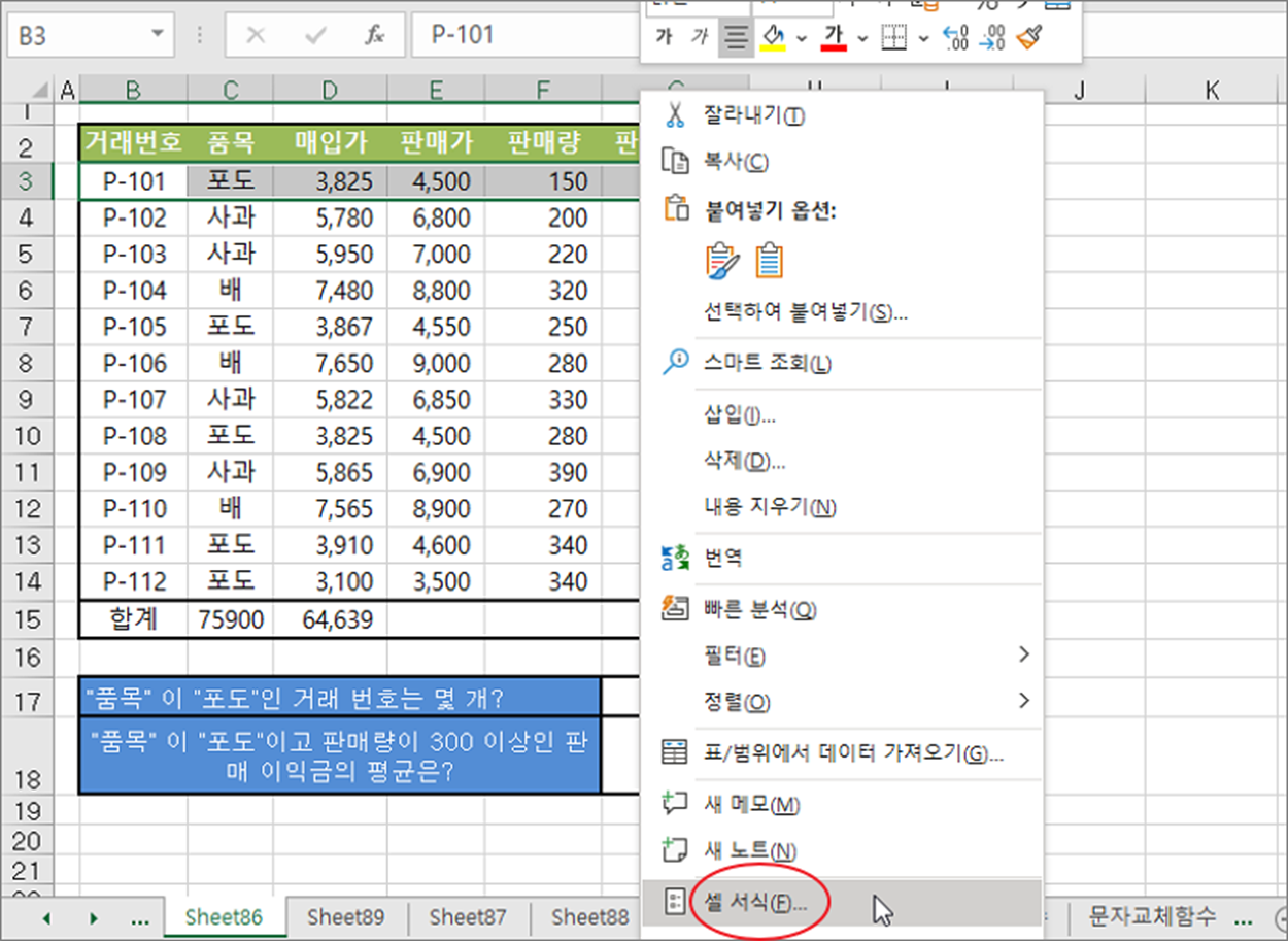 ▼ 취소선과 관련된 기능은 [셀 서식]에 있습니다. 취소선이 필요한 텍스트가 들어가 있는 셀 영역을 선택하고 Ctrl + 1 을 클릭하거나 오른 마우스를 눌러 [셀 서식] 메뉴를 선택합니다.