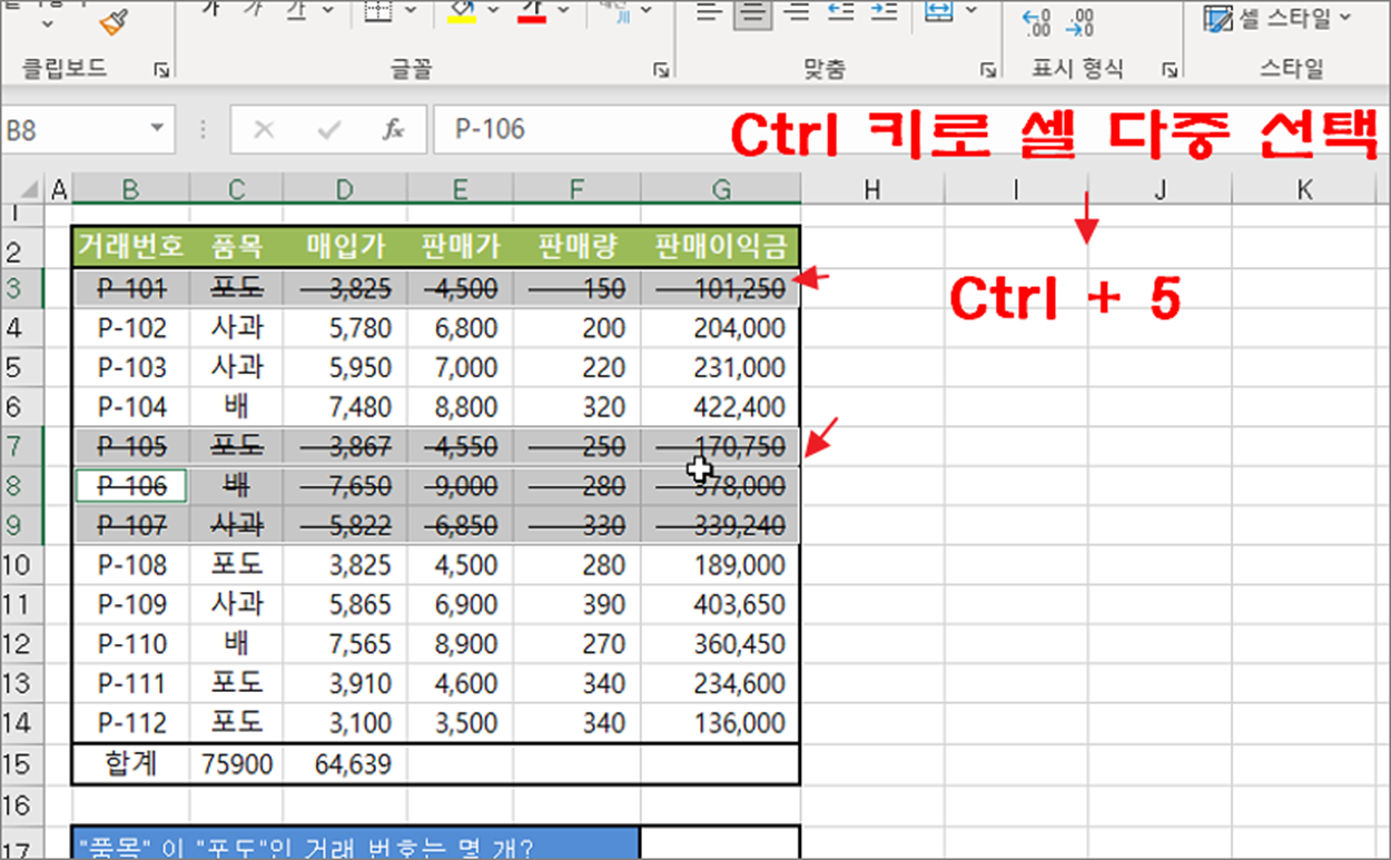 ▼ Ctrl 키를 이용해서 여러 셀을 선택한 이후 Ctrl + 5 를 눌러 한번에 적용할 수도 있습니다.