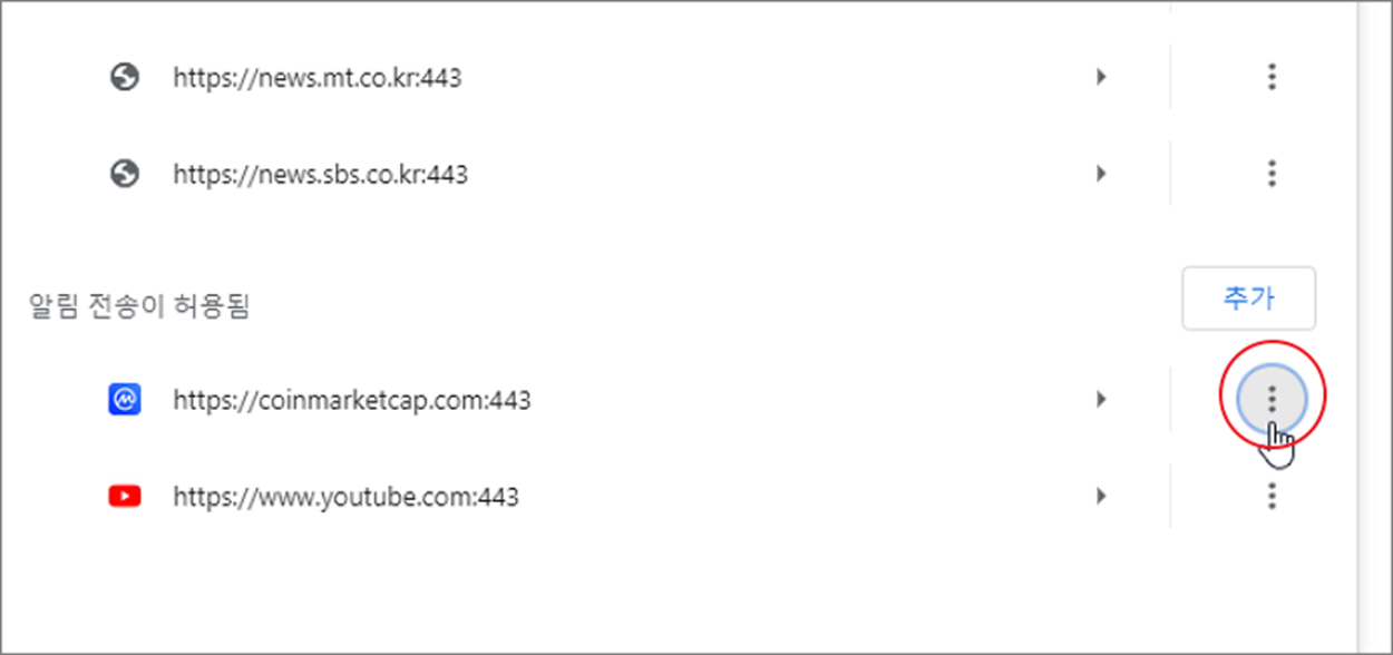 ▼ 또는 알림 전송이 허용되지 않음에 사이트를 추가해서 차단할 수도 있습니다. 상단 알림 전송이 허용되지 않음 항목으로 가서 추가 버튼을 클릭합니다.