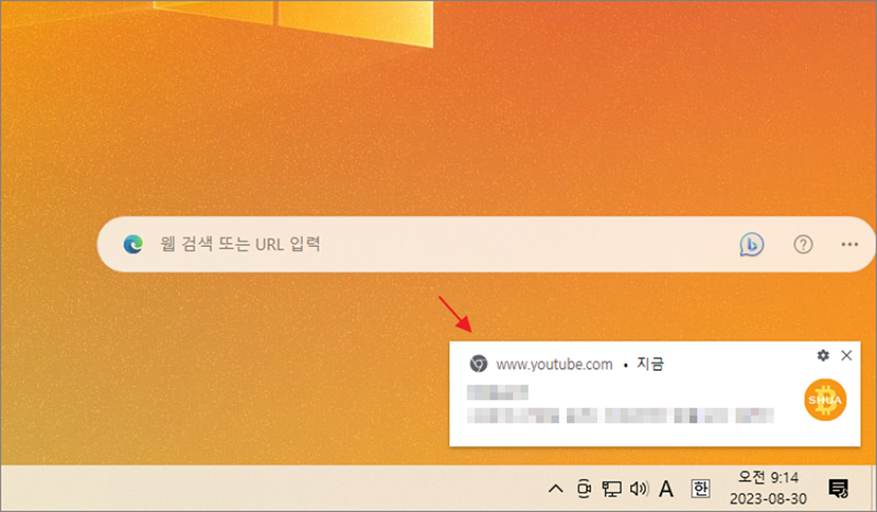 ▼ 그림은 윈도우에서 알림이 발생한 경우입니다. 오른쪽 하단에 유튜브에서 전송한 알림입니다.