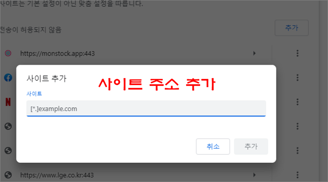 ▼ 사이트 추가 팝업창이 뜨면 차단하기를 원하는 URL 을 입력하고 추가 버튼을 클릭합니다.