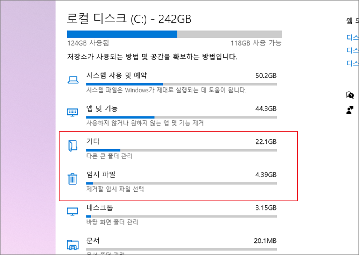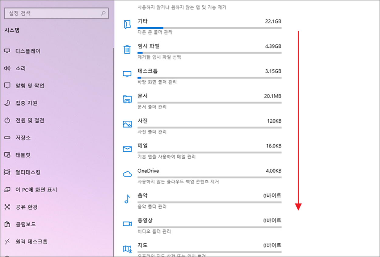 ▼ 이제 공간 확보를 위해 불필요한 파일이 어떤 것이 있는지 알아보겠습니다. 주로 공간을 많이 차지하는 “기타”와 “임시 파일” 입니다. 두 항목에 불필요한 파일들이 많기 때문에 최우선으로 정리합니다.