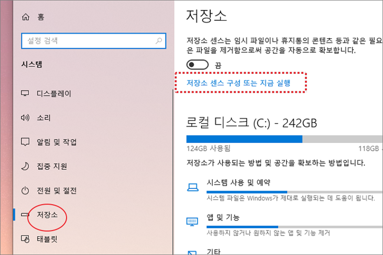 ▼ 매번 들어와서 공간이 부족한 것을 확인하고 삭제하기 귀찮다면 저장 공간 센스 기능을 이용해 보세요. 저장 공간 센스를 켜 놓으면 윈도우가 공간 부족을 체크해서 자동으로 공간 확보 기능을 실행합니다. 설정을 위해 그림에서 보이는 위치에 “저장소 센스 구성 또는 지금 실행” 메뉴를 클릭합니다.