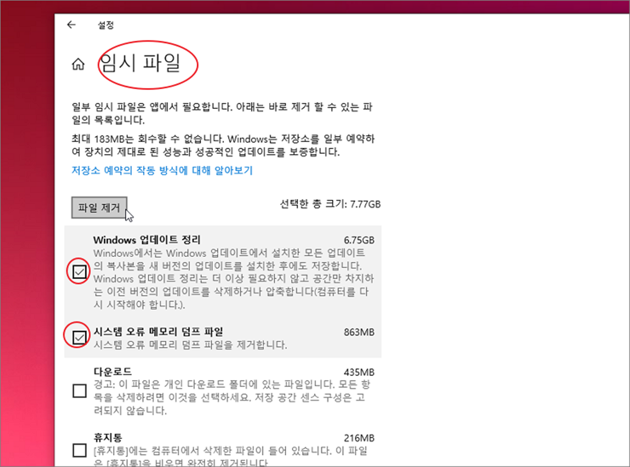 ▼ 기타 항목에 이어서 두 번째로 용량이 많은 임시 파일로 들어갑니다. 그림처럼 Windows 업데이트 사본 파일이나 로그 파일의 용량이 많다면 파일 제거 버튼을 눌러 삭제를 진행합니다.