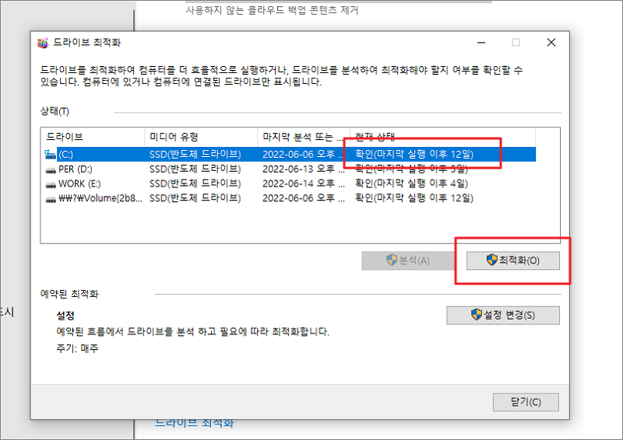 ▼ 그림처럼 윈도우7 에 있던 것도 동일하죠? 드라이브 목록에서 조각 모음 하고 싶은 대상을 선택하고 최적화 버튼을 누르면 분석한 다음 조각 모음을 실행합니다.