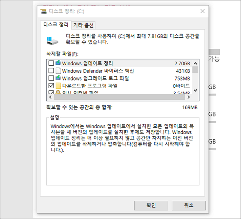 | ◎ 1. 윈도우 7 에 있던 디스크 정리 기능 사용하기 |