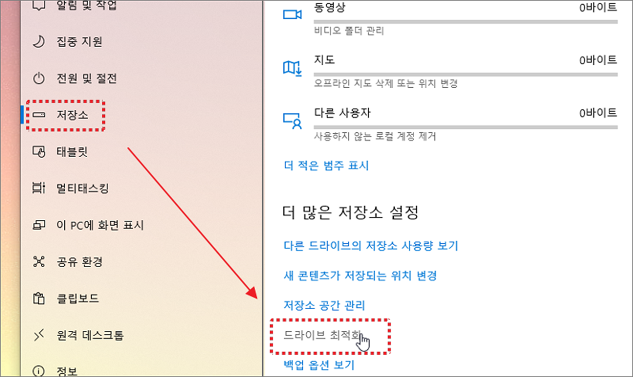 ▼ 또 다른 방법은 드라이브 최적화를 통해서 공간을 확보하는 방법입니다. “조각모음” 이라고도 하는데 윈도우7 과 설정화면은 동일합니다. 단지 윈도우10 설정 화면을 통해서 드라이버 최적화 팝업을 띄워야 합니다. 저장 공간 > 드라이브 최적화 링크를 클릭합니다.