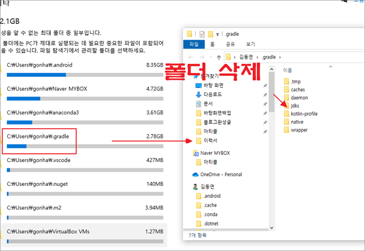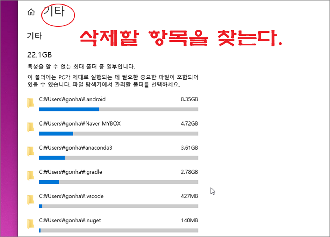 ▼ 불필요한 폴더를 정했다면 탐색기를 띄워서 직접 삭제해 줘야 합니다. 기타 항목을 클릭하면 해당 위치로 이동한 탐색기 창을 띄웁니다.