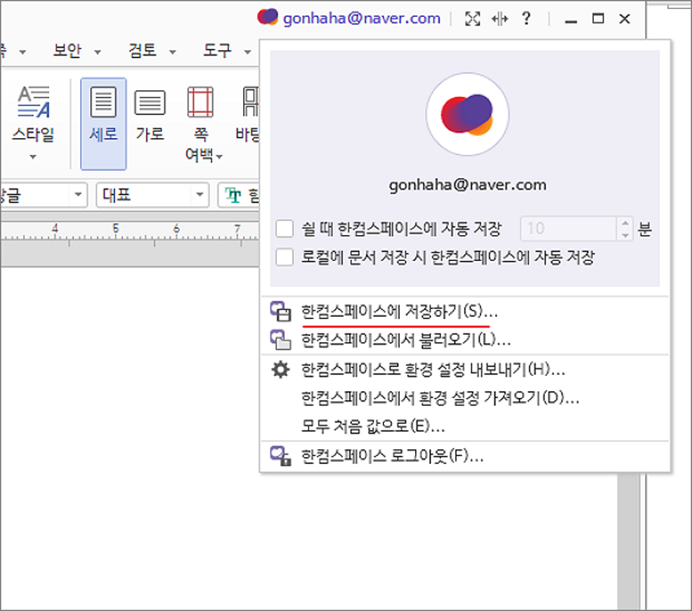 ▼ 그런데 현재 문서가 로그인했다고 해서 자동으로 저장되는 것은 아닙니다. 그림처럼 문서 상단에 로그인 아이디를 클릭하면 그림 같은 팝업창이 뜹니다. 여기 옵션 중에 “로컬에 문서 저장 시 한컴스페이스에 자동 저장” 이 있죠? 그리고 쉴 때 “한컴스페이스에 자동 저장” 두 가지를 제공합니다. 필요할 때 마다 사용자가 직접 저장하고 싶다면 아래에 한컴스페이스에 저장하기 메뉴를 이용합니다.